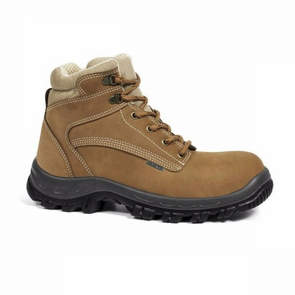 Botina para uso ocupacional com fechamento por atacador, confeccionada em vaqueta Nobuck, língua-fole, colarinho acolchoado, forro interno na gáspea não tecido e forro do cano em nylon bege dublado com manta de não tecido, ilhoses de gancho, solado injeção direta bidensidade bicolor e sobrepalmilha em EVA.