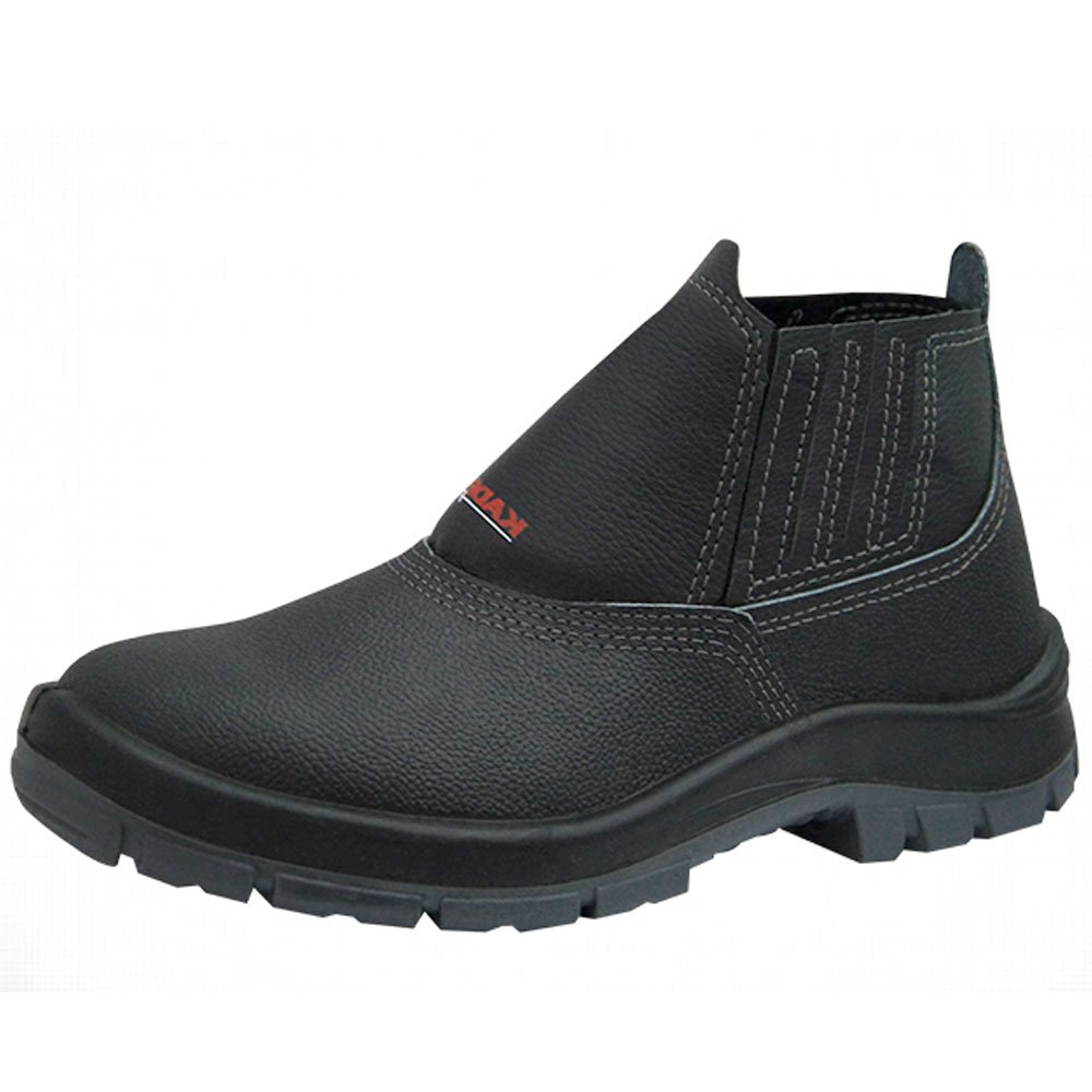 Botina em couro, na cor preta, fechamento em elástico, forração em tecido não tecido (tnt), palmilha de montagem sintética em tecido não tecido (tnt) costurada pelo sistema strobel. Solado em PU (poliuretano) injetado diretamente ao cabedal, bi densidade bicolor, com sistema de absorção de impactos e desenho plantar rebaixado para melhor mobilidade ao caminhar.