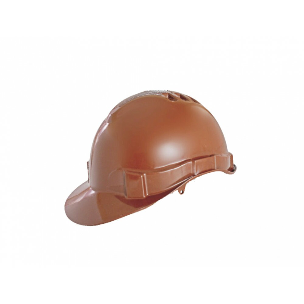 Capacete para uso na indústria, injetado em polietileno, com sistema de suspensão com carneira e coroas em polietileno e polipropileno, tipo separáveis, carneira fixada ao casco através de oito pontos de fixação, regulagem de tamanho por pino ou catraca, com tira absorvente de suor em poliuretano e couro sintético.|