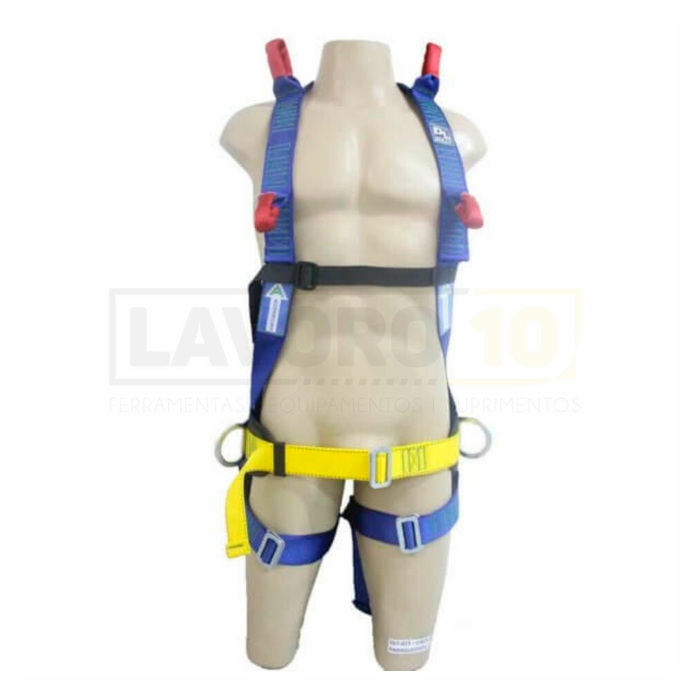 Cinturão de segurança do tipo paraquedista com 1 pontos de conexão; Construído em material sintético, poliéster; Conexão dorsal , uma argola ''D'' inclinada, em aço - Utilizada para retenção de quedas; Conexão lateral, duas argolas ''D'' inclinada, em aço - utilizada como porta ferramentas.