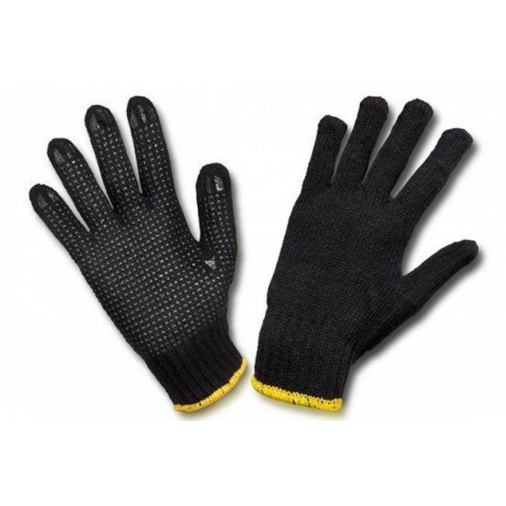Luva de segurança tricotada em fios de algodão e poliéster, palma e face palmar dos dedos com pigmentos antiderrapantes de PVC, punho em elástico.