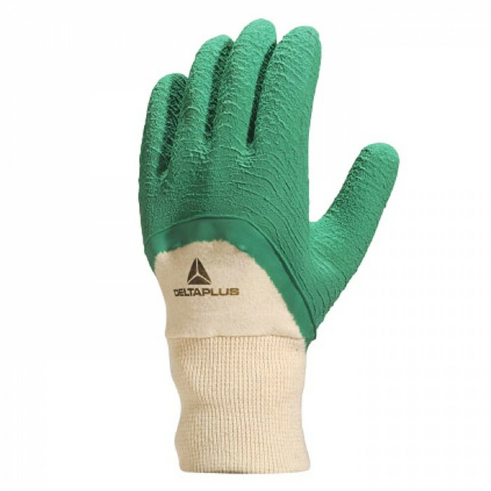 Luva em suporte têxtil 100% algodão com banho ¾ em látex verde corrugado e punho em malha canelada.||