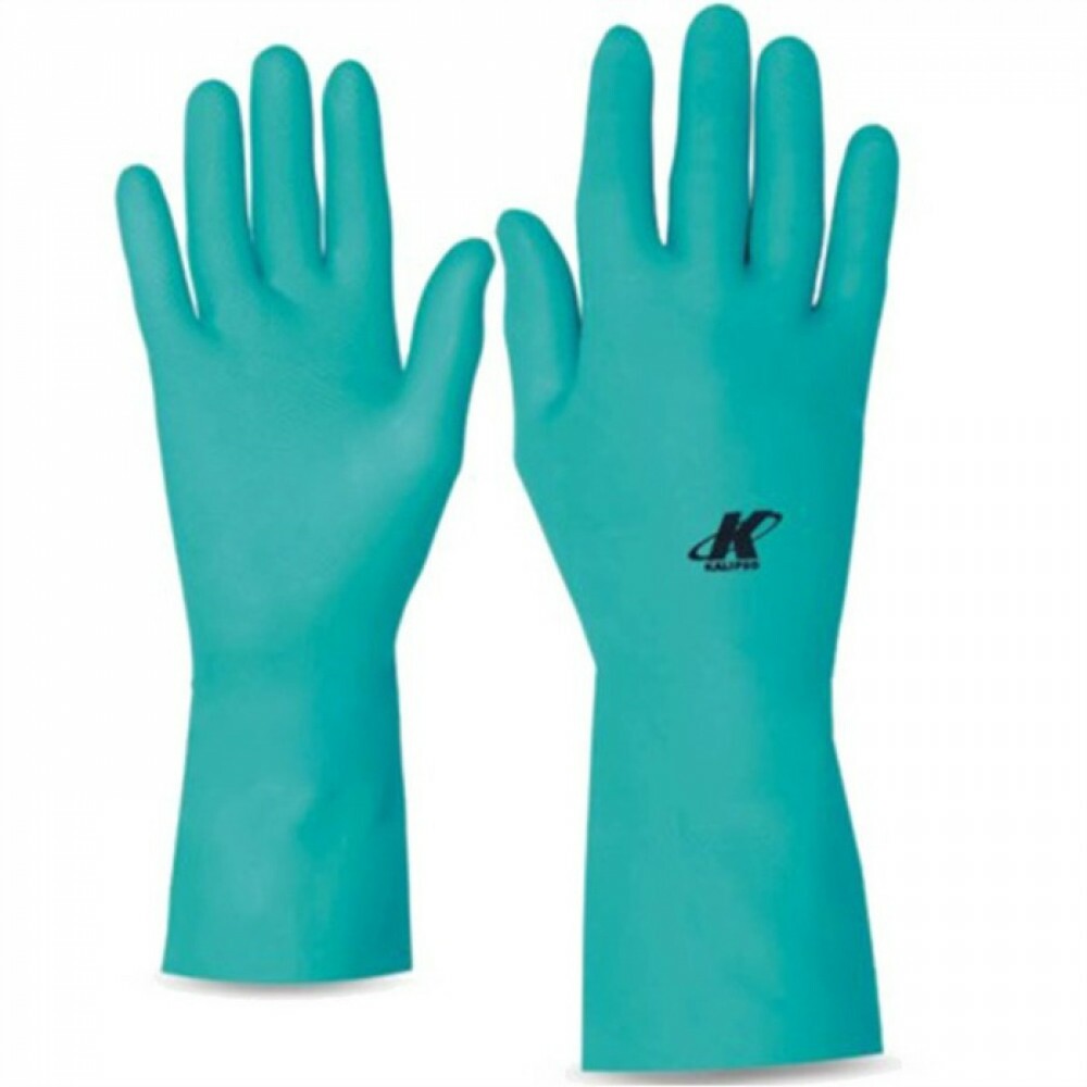 Luva de segurança confeccionada em látex nitrílico, forrada internamente com flocos de algodão, palma antiderrapante.
