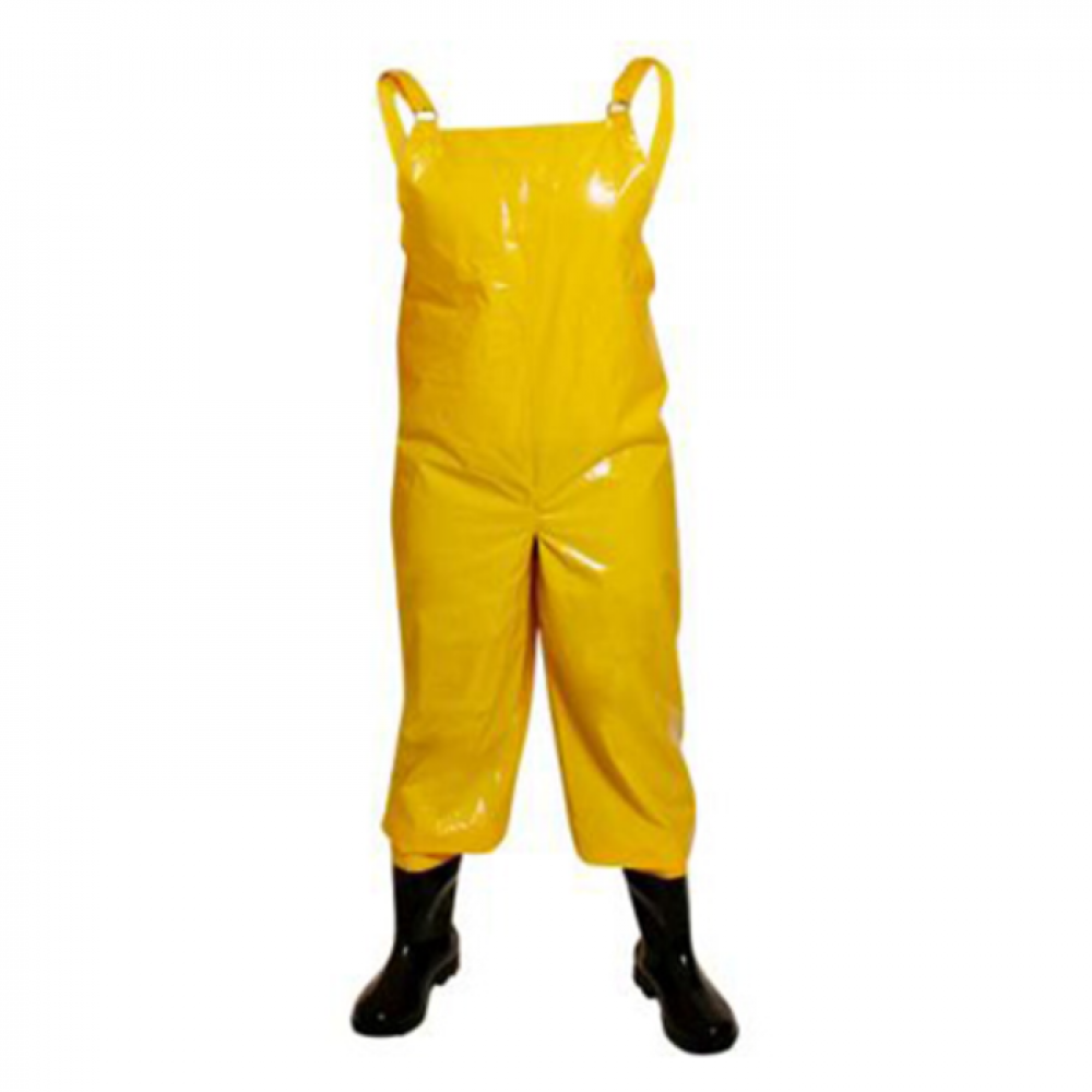Jardineira em tecido trevira KP 500 com peito alto tiras fixas e regulaveis por argolas, cor amarela .