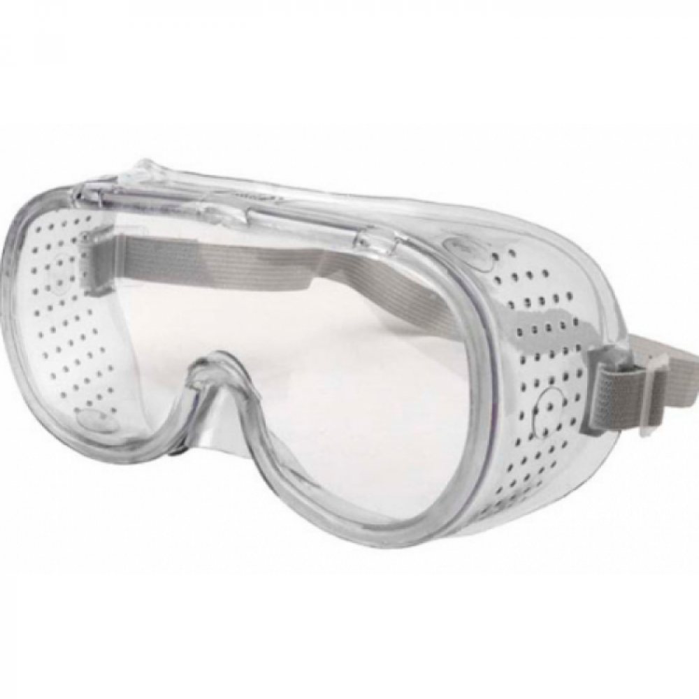 Óculos de segurança, composto de armação de material plástico flexível, tira elástica para ajuste a face do usuário, visor de policarbonato, cobrindo toda a região dos olhos e lateral perfurada