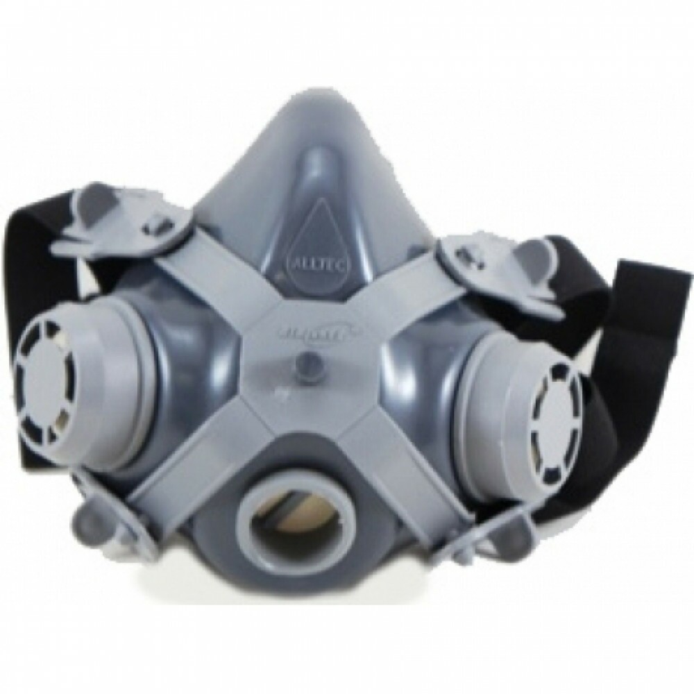 Respirador purificador de ar tipo peça um quarto facial, tamanho único, com corpo confeccionado em elastômero na cor cinza, com borda interna. Nas laterais do corpo da peça, estão localizadas duas aberturas, uma de cada lado, nas quais são encaixados 02 (dois) dispositivos de material plástico preto, dotados, cada um, de 01 (uma) válvula de exalação em sua parte interna e de uma tampa da mesma cor, com encaixe tipo pressão. A peça facial possui 01 (uma) abertura localizada em sua parte centro-inferior, na qual é fixado 01 (um) suporte plástico cinza claro, dotado de 01 (uma) válvula de inalação em sua parte traseira e de 01 (uma) rosca externa em sua parte dianteira, onde são rosqueados os filtros químicos. Os respiradores possuem, na parte central do seu corpo, um ponto (saliência) para o encaixe de um suporte plástico cinza claro. Este suporte é dotado de 04 (quatro) hastes, onde são fixadas (quatro) fivelas plásticas, através das quais passam as pontas de 02 (dois) tirantes elásticos ajustáveis na cor preta: um tirante localizado na parte superior e o outro, na parte inferior. No tirante localizado na parte superior, encontram-se costuradas 02 (duas) alça plásticas na cor cinza claro, para encaixe na cabeça do usuário.