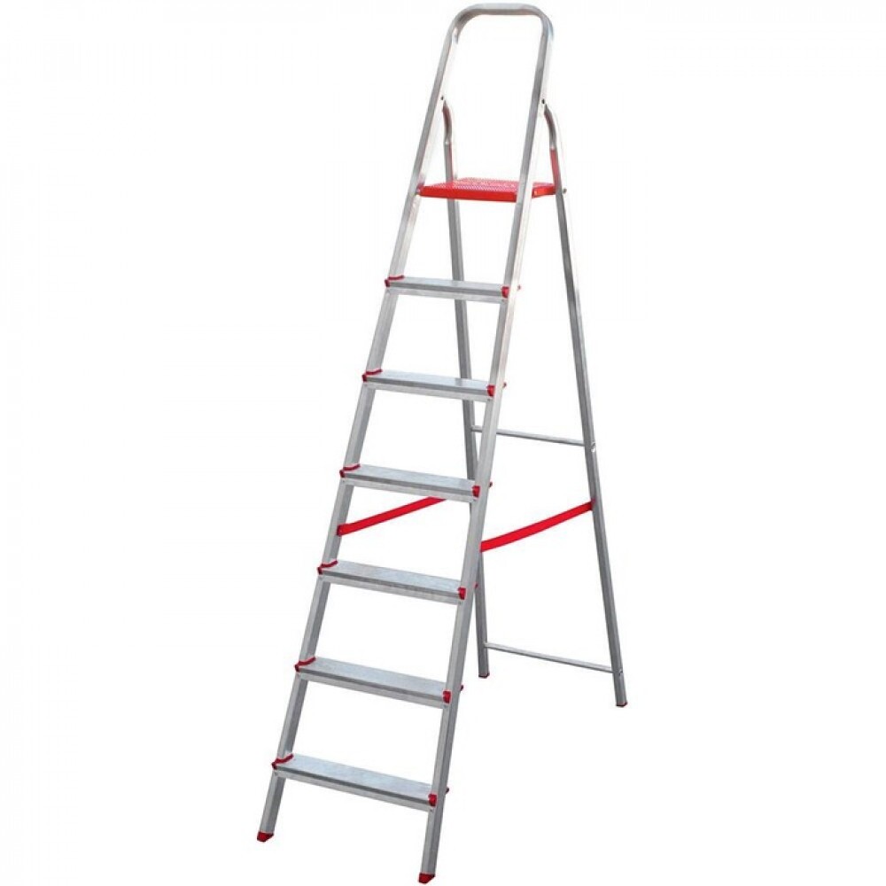 ESCADA DE USO RESIDENCIAL. Características: Não enferruja: Alumínio Material extremamente leve. Carga máxima de 100kg conforme Norma NBR 13430. Fácil de guardar: Profundidade fechada de aprox. 11,3 cm Patamar auto-travante em polímero de alta resistência. ESPECIFICAÇÕES: Degraus: 7 (6 degraus + Patamar) Altura fechada: 2,18m Altura quando aberta até plataforma: 1,56m Profundidade fechada: 0,11m Peso aprox.: 4,8 Kg