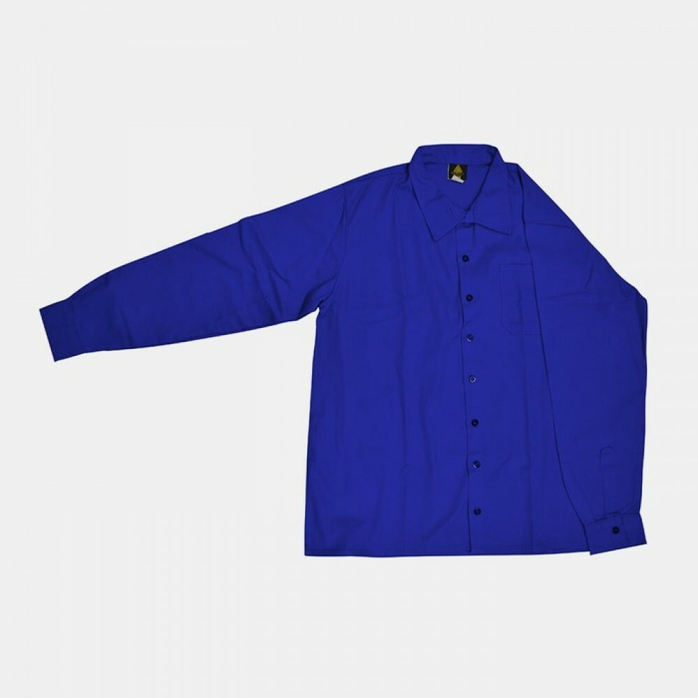 Uniforme profissional em brim, reforçado. Camisa com botão ou fechada, sem bolso ou com um bolso na altura do peito, manga longa.