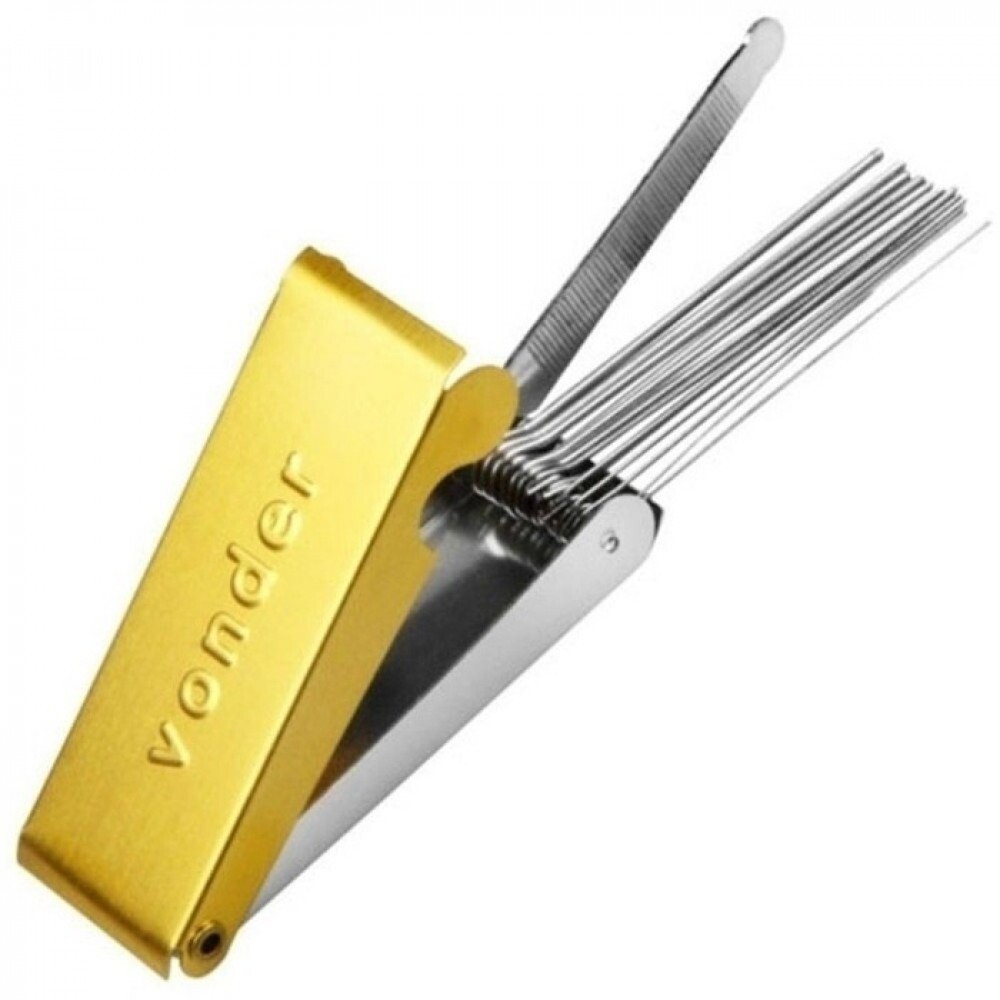 Utilizados para limpeza de bicos de corte e extensões de solda Jogo com 12 agulhas de aço inox com superfície recartilhada e lima metálica, condicionadas em estojo de alumínio