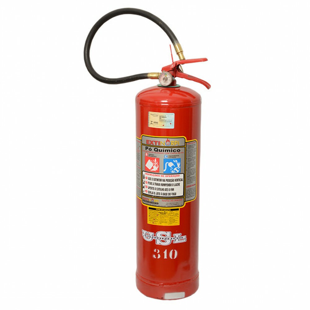 Extintor portátil com 12Kg de Pó Quimico à Base de Bicarbonato de Sódio. Indicação: Princípios de incêndios em liquidos inflamáveis (gasolina, óleo, tinner) e em equipamentos elétricos energizados (quadros de comando, computadores). Classe Extintora: BC