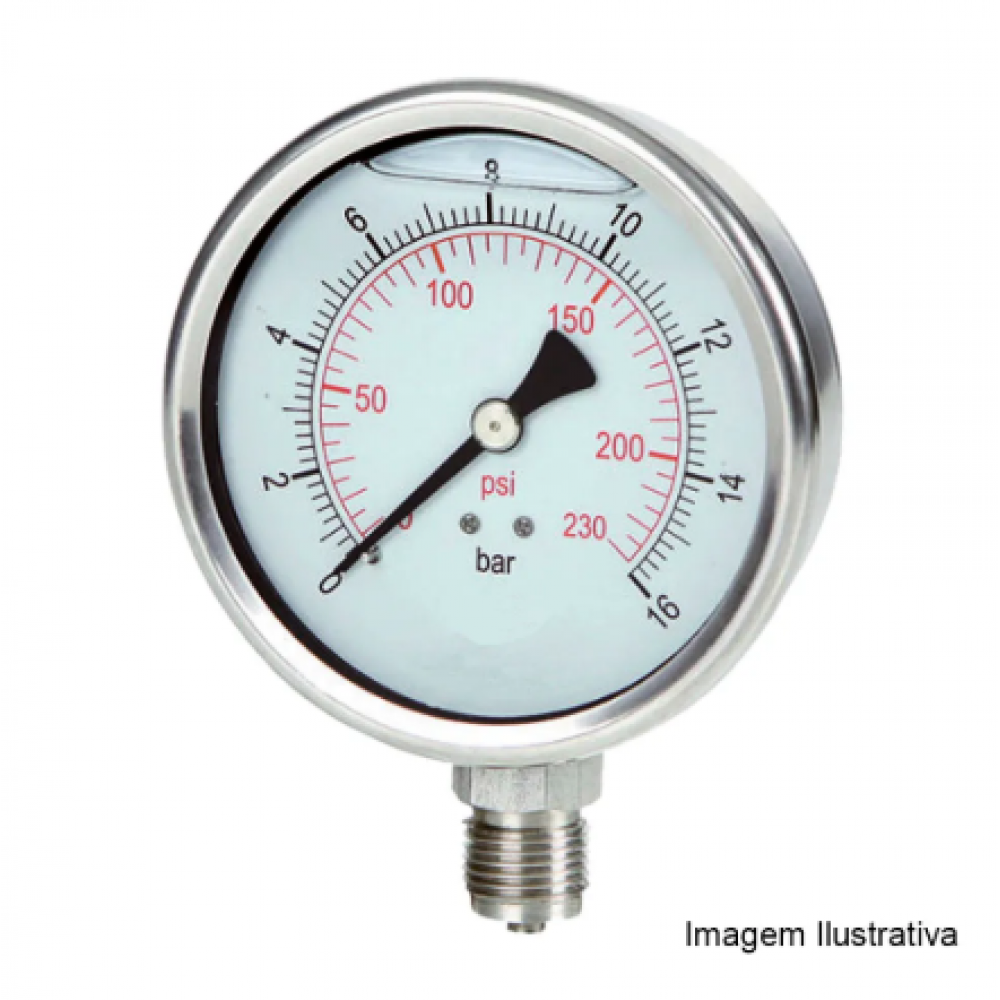 Manômetro com Glicerina Mostrador Ø100mm Total Inox Rosca de 1/2"NPT Escala 0 a 10kgf/cm² Reto Tecno TECN-750.100R10|Manômetro sensor tipo Bourdon de construção totalmente em inox, para aplicação em que o fluído do processo e o meio ambiente caracterizam-se pela sua agressividade química.|Opera com todos os tipos de gases, líquidos e vapor, exceto, aqueles muito viscosos ou com tendência à cristalização. A caixa com o anel baioneta oferece perfeita hermeticidade à chuva, poeira ou agressão do meio ambiente como impactos e corrosão.
