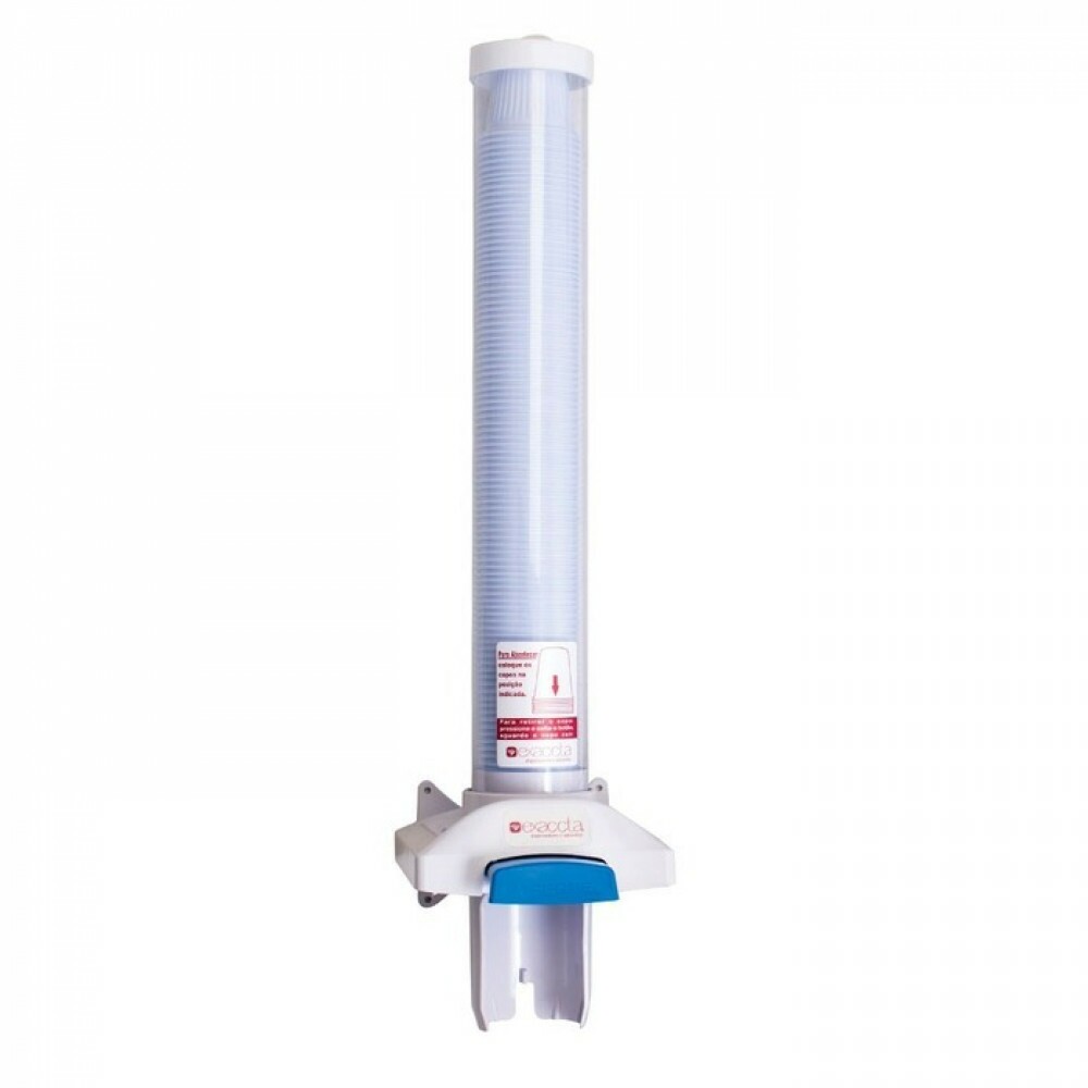 Porta copos com capacidade para 120 copos de 200ml, nas cores branco e transparente, com alavanca para liberar apenas 1 copo por vez.