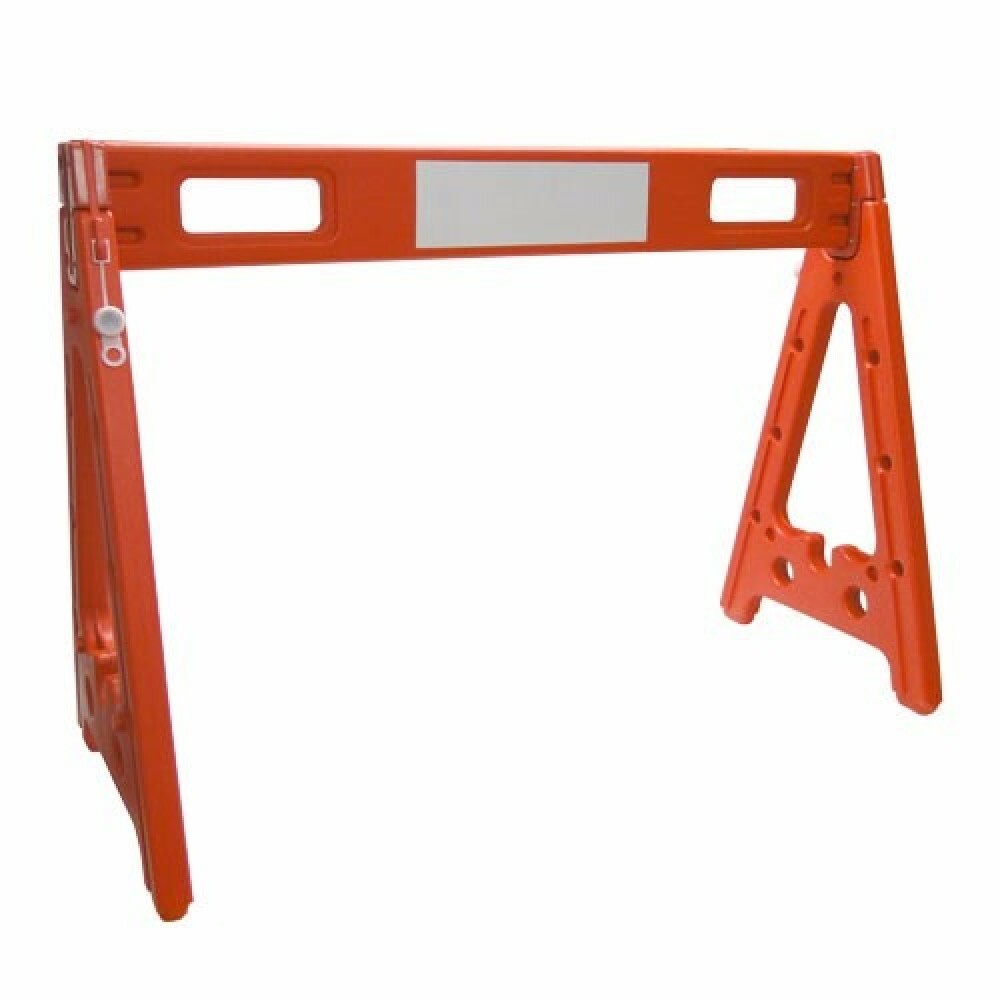 Cavalete plástico totalmente desmontável, suas laterais podem ser enchidas com água para uma melhor estabilidade. Possui refletivo e produzido em polietileno.