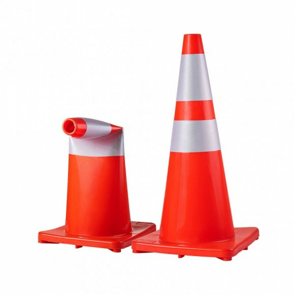 Cone de sinalização que atende a ABNT 15071 da Associação Brasileira de Normas Técnicas - ABNT. Esse cone para sinalização viária extra-flexível, permita dobrá-lo totalmente ao meio sem prejuízo do seu formato original. O cone é fornecido na cor laranja e resistente a intempéries, possui altura de 75 cm e peso mínimo de 3 KG. A base do cone é composta por oito sapatas distribuídas uniformemente melhorando sua fixação ao solo e permitindo a passagem de água sob o cone, evitando deslocamentos involuntários. O cone possui dois rebaixos que servem para evitar o desgaste provocado pelo atrito em tempo de empilhamento, e onde são colocados os anéis refletivos. Os anéis são retro-refletivos, microprismáticos à base de PVC com forro plástico com refletividade mínima de 300 candelas/lux/m2, tendo cada anel 10 CM de altura.