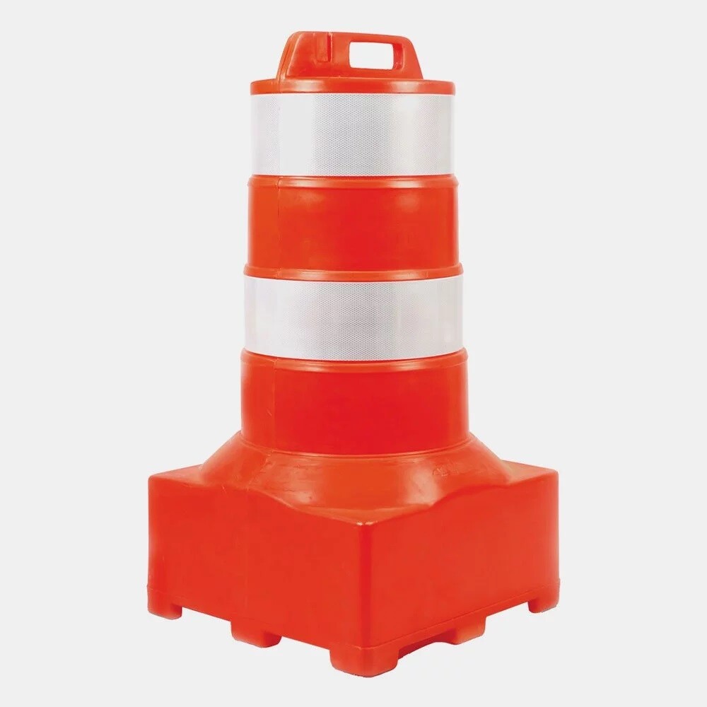 Cone de sinalização viária, material empilhável, na cor laranja com proteção contra raios UV, altura total de 1,10 m, peso entre 5,5 a 6 kg formato cilíndrico, base quadrada com cantos arredondados de 25 cm de altura, base quadrada de 60 cm.