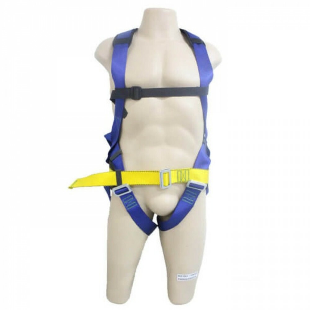 É confeccionado em fita de poliéster de 45mm para trabalho em altura, possui 1 pontos de ancoragem dorsal, dotado de três fivelas duplas sem pino, confeccionados em aço forjado para regulagem. O cinturão possui uma argola em D de aço forjado fixado ao cinto através de um passador plástico simples, e uma fita de poliéster de 25mm utilizada para ajuste peitoral.