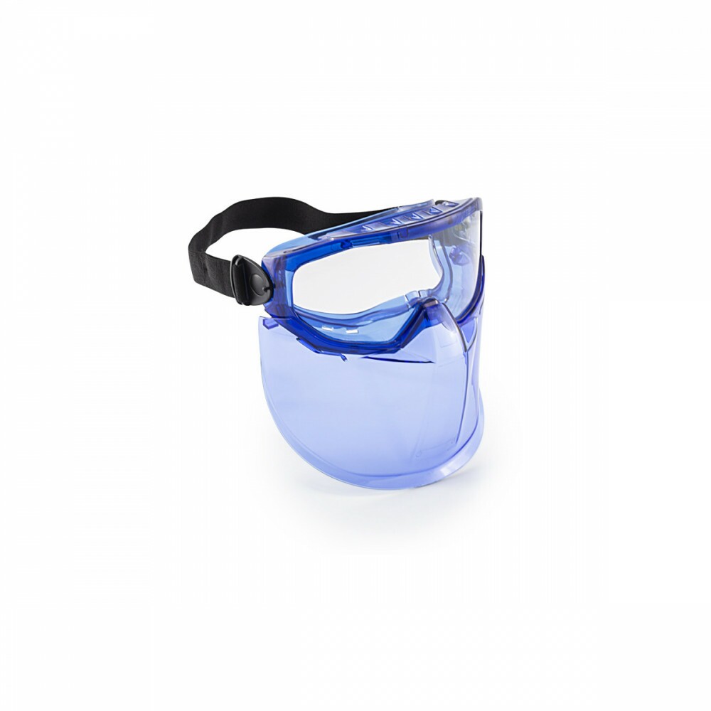 Óculos de proteção modelo ampla visão, armação e visor confeccionados em uma única peça de PVC flexível, com sistema de ventilação indireta composta de onze fendas na parte superior e seis na parte inferior, tirante elástico para ajuste e visor de policarbonato.