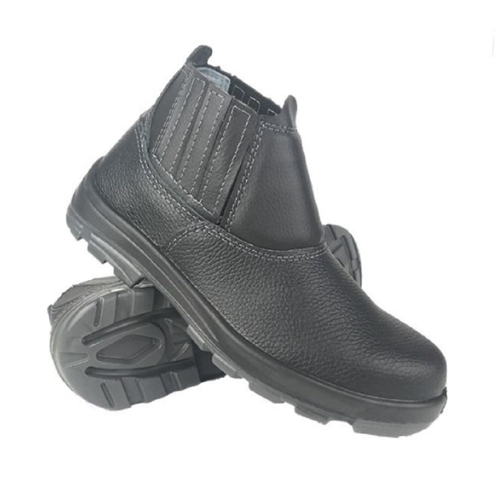 COURO CURTIDO AO CROMO C/ELAST BI DENS ELETRICISTA. Calçado ocupacional de uso profissional tipo botina, modelo blatt, fechamento em elástico, confeccionado em couro curtido ao cromo. Palmilha de montagem em material reciclável montada pelo sistema strobel, com bico de conformação, solado de poliuretano bidensidade injetado direto no cabedal resistente ao óleo combustível.