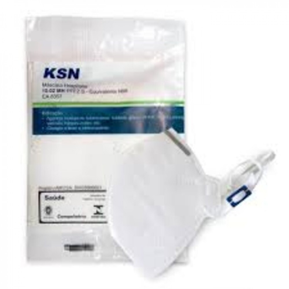 Máscara Hospitalar|Código 10.02 MH - PFF2 S|CA 8357|CARACTERÍSTICAS|Composição: Confeccionado em quatro camadas, sendo: camada externa de|fibra sintética de polipropileno; camada meio de fibras sintética estrutural;|camada filtrante de fibra sintética com tratamento eletrostático, camada interna|de fibra sintética de contato facial. Com tirantes de cabeça de elástico para|sustentação da peça facial e tira metálica para ajuste sobre o septo nasal.|Materiais atóxicos e hipoalergênicos.|Cor: Branca.|DESEMPENHO|Este respirador enquadra-se na categoria D.1 b) peça semifacial filtrante|(PFF2) para proteção das vias respiratórias contra poeiras, névoas e fumos.|Respirador conforme norma NBR 13698 para Peça Semifacial Filtrante.|Penetração máxima através do filtro (1) 6%|Resistência máxima a inalação (2) 240 Pa|Resistência máxima a exalação (2) 300 Pa|APROVAÇÃO|ANVISA 80425989001 - Classificação de risco: I.|Certificação INMETRO sob nº BRP31438003 em conformidade com os|requisitos estabelecidos pela Portaria nº 561, de 23 de Dezembro de 2014.|Látex Free|KSN Proteção Respiratória|Fone: +55 11 4602 ¿ 6777|Emitido em agosto de 2017|(1) Além dos ensaios mencionado nas notas (2) e (3), outros são requeridos|pela norma NBR 13698, tais como Inflamabilidade, tração na válvula de|exalação, vazamento na válvula de exalação, entre outros. Somente|após comprovação de eficiência em todos os requisitos o respirador é|considerado aprovado e recebe o Certificado INMETRO e Certificado de|Aprovação (C.A).|(2) Ensaios são realizados em laboratório, em equipamento utilizando|aerossol de cloreto de sódio (NaCl) com diâmetro entre 0,3 e 0,6 mícron|e vazão de ar igual a 95 litros/min.|(3) Ensaio realizado em laboratório, em equipamentos com fluxo contínuo|de ar de 30, 95 e 160 litros/min.|INDICAÇÃO DE USO|¿ Indicado para proteção das vias respiratórias dos trabalhadores da área|da saúde contra exposição de agentes biológicos causadores de|tuberculose, rubéola, SRAG/SARS, varicela, sarampo, gripes H1N1 e|H5N1, etc. e certos aerodispersóides em faixa de tamanho de partículas|de 0,1 a 10 micra (diâmetro aerodinâmico médio) ou maiores, incluindo|as geradas por eletrocautério, cirurgia a laser entre outros instrumentos|médicos elétricos.|Máscara Hospitalar|Código 10.02 MH - PFF2 S|CA 8357|CARACTERÍSTICAS|Composição: Confeccionado em quatro camadas, sendo: camada externa de|fibra sintética de polipropileno; camada meio de fibras sintética estrutural;|camada filtrante de fibra sintética com tratamento eletrostático, camada interna|de fibra sintética de contato facial. Com tirantes de cabeça de elástico para|sustentação da peça facial e tira metálica para ajuste sobre o septo nasal.|Materiais atóxicos e hipoalergênicos.|Cor: Branca.|DESEMPENHO|Este respirador enquadra-se na categoria D.1 b) peça semifacial filtrante|(PFF2) para proteção das vias respiratórias contra poeiras, névoas e fumos.|Respirador conforme norma NBR 13698 para Peça Semifacial Filtrante.|Penetração máxima através do filtro (1) 6%|Resistência máxima a inalação (2) 240 Pa|Resistência máxima a exalação (2) 300 Pa|APROVAÇÃO|ANVISA 80425989001 - Classificação de risco: I.|Certificação INMETRO sob nº BRP31438003 em conformidade com os|requisitos estabelecidos pela Portaria nº 561, de 23 de Dezembro de 2014.|Látex Free|KSN Proteção Respiratória|Emitido em agosto de 2017|(1) Além dos ensaios mencionado nas notas (2) e (3), outros são requeridos|pela norma NBR 13698, tais como Inflamabilidade, tração na válvula de|exalação, vazamento na válvula de exalação, entre outros. Somente|após comprovação de eficiência em todos os requisitos o respirador é|considerado aprovado e recebe o Certificado INMETRO e Certificado de|Aprovação (C.A).|(2) Ensaios são realizados em laboratório, em equipamento utilizando|aerossol de cloreto de sódio (NaCl) com diâmetro entre 0,3 e 0,6 mícron|e vazão de ar igual a 95 litros/min.|(3) Ensaio realizado em laboratório, em equipamentos com fluxo contínuo|de ar de 30, 95 e 160 litros/min.|INDICAÇÃO DE USO|¿ Indicado para proteção das vias respiratórias dos trabalhadores da área|da saúde contra exposição de agentes biológicos causadores de|tuberculose, rubéola, SRAG/SARS, varicela, sarampo, gripes H1N1 e|H5N1, etc. e certos aerodispersóides em faixa de tamanho de partículas|de 0,1 a 10 micra (diâmetro aerodinâmico médio) ou maiores, incluindo|as geradas por eletrocautério, cirurgia a laser entre outros instrumentos|médicos elétricos.|¿ Proteção das vias respiratórias em procedimentos com risco de|projeções de sangue entre outros fluidos corpóreos potencialmente|contagiosos. Neste caso é recomendado o uso dos demais|equipamentos de segurança.|¿ Este respirador oferece EFB - Eficiência de Filtração Bacteriológica >|99% e resistência a penetração de sangue e outros fluidos corpóreos.|¿ Somente para uso contra aerossóis sólidos e líquidos base água,|poeiras, névoas e fumos, nas áreas de manutenção.|Deve ser utilizado mediante o conhecimento e aprovação das áreas de|Higiene, Segurança e Medicina do Trabalho ou responsável pela empresa. É|de uso pessoal e intransferível|KSN Proteção Respiratória|CONDIÇÕES DE ARMAZENAMENTO E TRANSPORTE|¿ Deve ser mantido em local limpo, seco e ventilado, e protegido contra|agentes físicos e químicos entre outros que ofereça dano ao produto.|¿ Temperatura entre: -20 °C á 40 °C.|¿ Umidade relativa máxima: < 95%|¿ Empilhamento máximo: 10 caixas.|VIDA ÚTIL|¿ Descarte o respirador após no máximo o uso por um turno de trabalho,|se aplicável. (conforme NBR 13698).|¿ Substitua-o quando estiver rasgado, saturado ou com elástico solto ou|rompido. A saturação varia em função da concentração dos|contaminantes, frequência respiratória do usuário, temperatura e|umidade relativa do am
