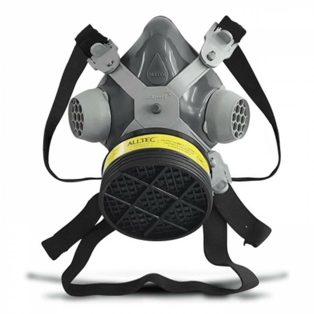 Respirador purificador de ar tipo peça um quarto facial, tamanho único, com corpo confeccionado em elastômero na cor cinza, com borda interna. Nas laterais do corpo da peça, estão localizadas duas aberturas, uma de cada lado, nas quais são encaixados 02 (dois) dispositivos de material plástico preto, dotados, cada um, de 01 (uma) válvula de exalação em sua parte interna e de uma tampa da mesma cor, com encaixe tipo pressão. A peça facial possui 01 (uma) abertura localizada em sua parte centro-inferior, na qual é fixado 01 (um) suporte plástico cinza claro, dotado de 01 (uma) válvula de inalação em sua parte traseira e de 01 (uma) rosca externa em sua parte dianteira, onde são rosqueados os filtros químicos. Os respiradores possuem, na parte central do seu corpo, um ponto (saliência) para o encaixe de um suporte plástico cinza claro. Este suporte é dotado de 04 (quatro) hastes, onde são fixadas (quatro) fivelas plásticas, através das quais passam as pontas de 02 (dois) tirantes elásticos ajustáveis na cor preta: um tirante localizado na parte superior e o outro, na parte inferior. No tirante localizado na parte superior, encontram-se costuradas 02 (duas) alça plásticas na cor cinza claro, para encaixe na cabeça do usuário.