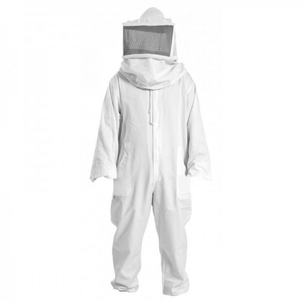 Macacão de segurança confeccionado em tecido poliamida/algodão, capuz integrado e articulado, fechamento em zíper, bolso laterais e de ferramentas, punho em malha e elástico no tornozelo.