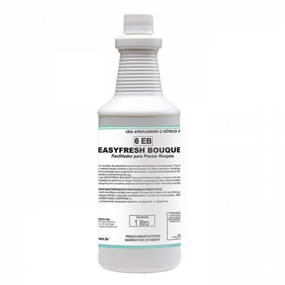 Propriedades: EASYFRESH BOUQUET é um auxiliar de passadoria para roupas. Formulado com matérias primas de última geração, facilita a operação de passadoria e ao mesmo tempo amacia e perfuma tecidos de fibras naturais e sintéticas. EASYFRESH BOUQUET em sua aplicação elimina a aspereza das roupas, melhora a proteção de enrugamento dos tecidos, suporta alta temperatura (200°C), otimizando o efeito passa fácil reduzindo a eletricidade estática dos tecidos, tornando-os confortáveis ao uso. Instruções de uso: Recomendamos o uso de EASYFRESH BOUQUET puro pulverizando sobre a roupa a ser passada para um melhor efeito de anti-rugas e gomagem. Para apenas perfumar a roupa e facilitar a passagem a ferro recomendamos diluir o produto até 1:2. EASYFRESH BOUQUET deve ser utilizado em conjunto com os outros produtos da linha Higiene Têxtil. Restrito ao uso profissional. Para abrir a embalagem force o lacre girando a tampa. Não armazenar próximo a alimentos. Dados Técnicos: Aparência: Líquido turvo Cor: Levemente esverdeado Odor: Bouquet pH: 4,0 - 6,0 Peso específico: 0,995 - 1,020 g/cm³ Viscosidade: 1,0 - 10,0 cps Teor de ativos: 3,0 - 6,0% Registro do Ministério da Saúde / Produto notificado na ANVISA - A.F. n° 3.00018-9